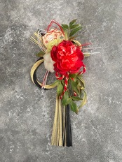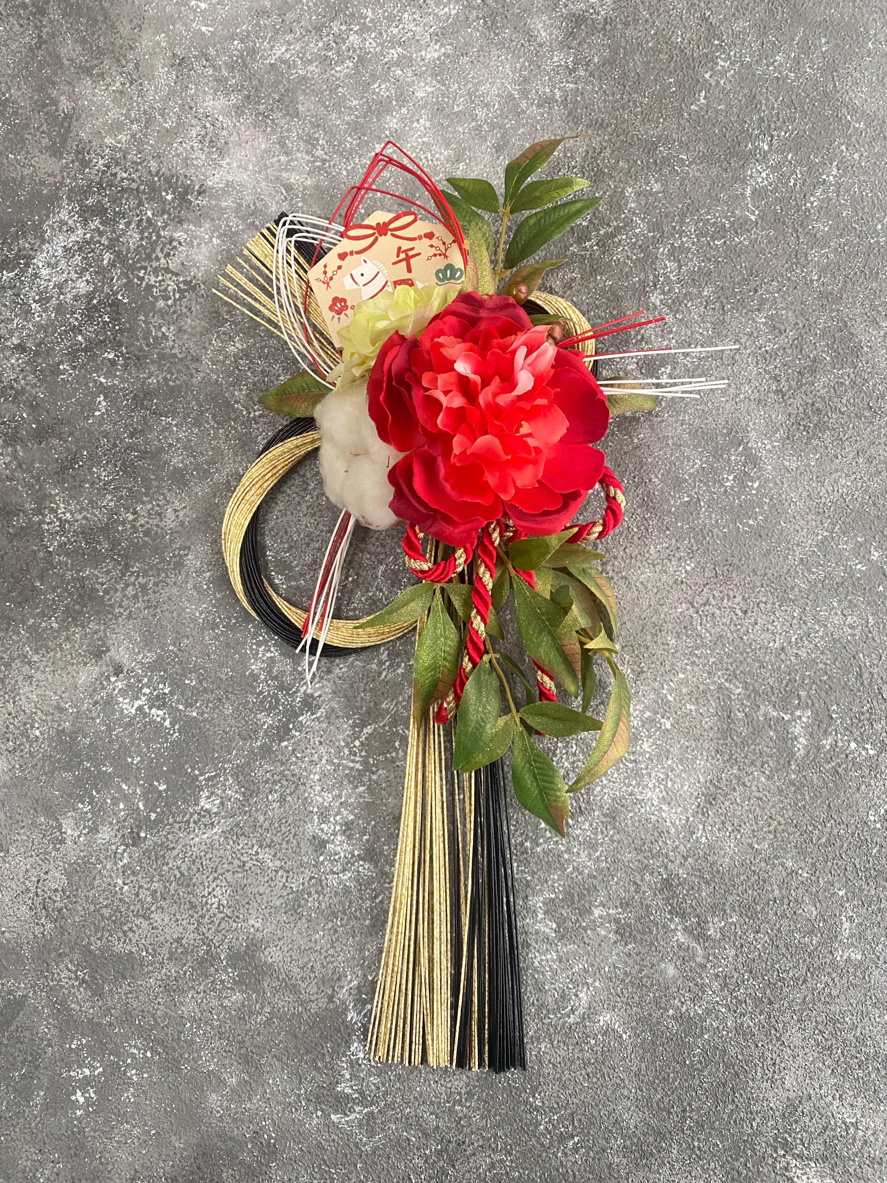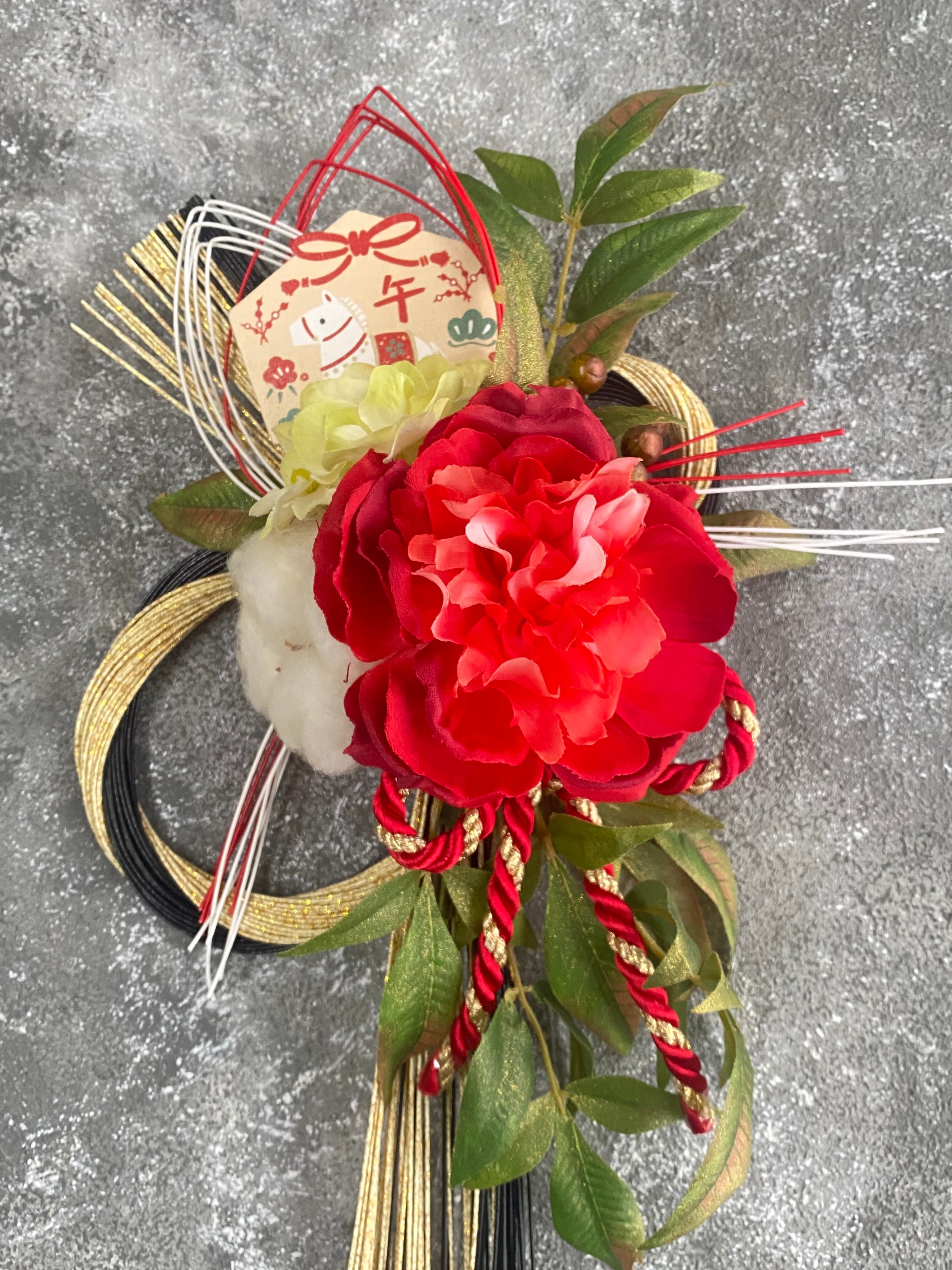 赤い花を主役に、黒×金の水引と南天の葉を合わせ、伝統的でありながらもすっきりとしたデザインに仕上げました。