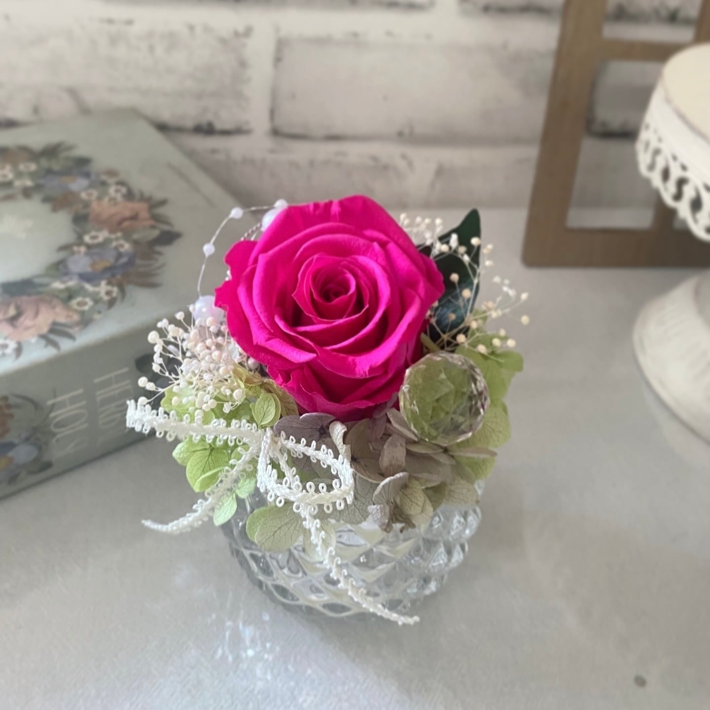 プリザーブドフラワーは花材の性質上、多少の割れやカケなど生じる場合がございますのでご了承下さい。