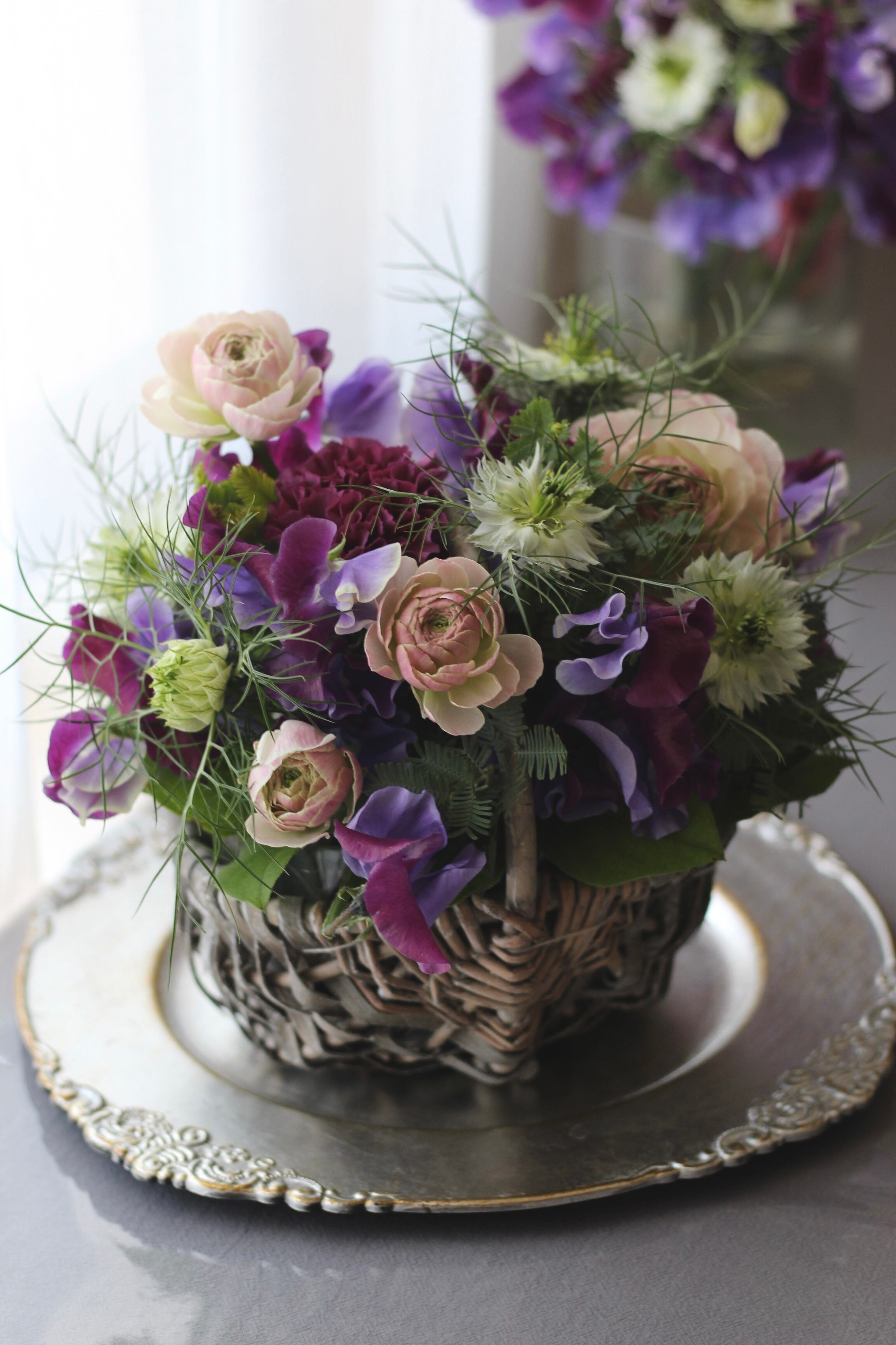 持ち手付きのバスケットにお花をアレンジします。